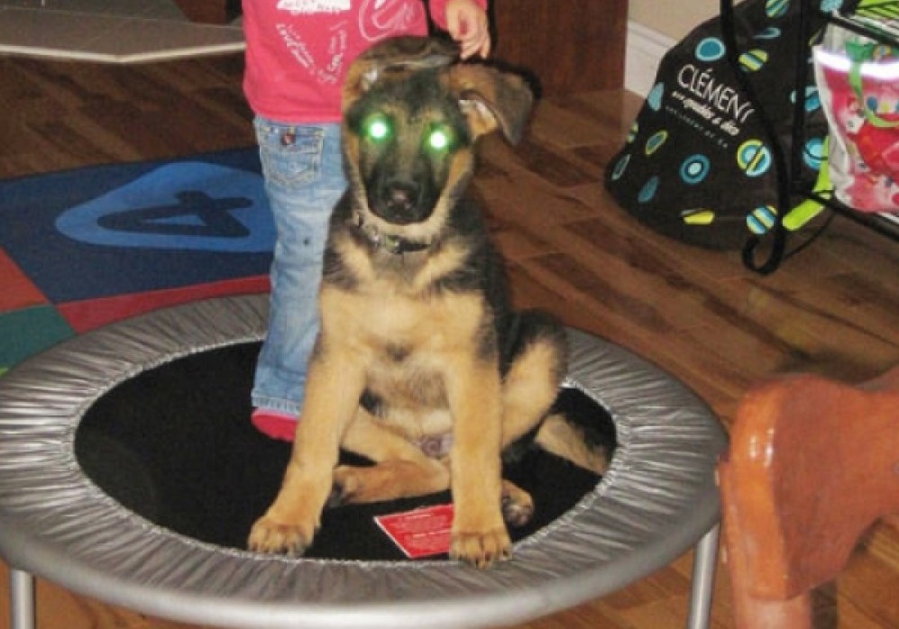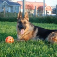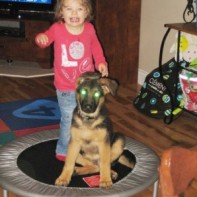 Bonjour Martine! Hé oui! Ça fait maintenant 1 mois et demi que nous avons notre Bosko! C'est notre premier chien et tout se passe à merveille! Nous avons une garderie familiale et une petite fille de 23 mois et Bosko s'est très bien adapté à son nouvel environement. Grâce à la qualité de ton élevage, nous avons eû la chance d'avoir un chien équilibré dès sa naissance! Un gros merci! Les enfants de la garderie l'adorent! Martine, tu sais quoi? Je me demande bien ce que ma petite femelle est devenue, mais je ne regrette pas mon choix! J'ai choisi le plus petit mâle de la porté mais selon moi, il sera finalement le plus costaud de tous! Nous lui avons installé une petite cloche près de la porte et lorsqu'il veut sortir, il sonne la cloche! Lorsque nous allons au parc, il aime bien monter les marches des glissades pour glisser par la suite! Il sera certainement génial aux cours d'agilité, en plus d'être déjà très sociable avec les autres animaux. Bref, notre chien est super! Voici une photo de notre chien prise ce soir; il a maintenant 3 mois et 1 semaine et il fait de la trampoline avec notre fille. Si vous cherchez un chiot équilibré et d'une beauté exceptionnelle, pensez au Domaine du Berger Allemand! Merci!!