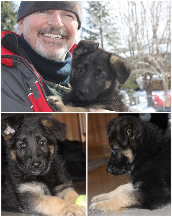 Juste un petit mot pour vous présenter " SKY " qui est maintenant âgé de trois mois. Il est très calme, affectueux et espiègle avec tou ce qu'il peut trouver sur le plancher ( sans toutefois briser, car il le sait ;-))! Sky est dèja propre, il sais s'asseoir, se coucher, il nous donne la patte et plusieurs autres petits trucs qui nous font sourire. Son air charmant et indépendant sait plaire a tout les passants. J'en profites d'ailleurs pour remercier Mme Bouchard qui a pris le temps de bien nous accueillir en nous présentant chacun de ses chiens et ce malgré la tempête. La propreté des lieux, son organisation et son amabilité a répondre a toutes nos questions, sont remarquables. Elle demeure une très bonne référence! C'est une dame passionnée qui nous transmet grandement les mérites du Berger Allemand. Raynie et Lily-Rose