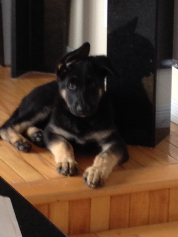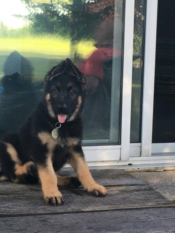 Voici Rosco, il a maintenant 7 mois. Il est très intelligent et affectueux. Un tempérament équilibré et très gentil avec tous. Un look incroyable, il est devenu un beau gros berger allemand. Il fait maintenant 88 lbs, il est physiquement parfait selon le vétérinaire. Merci pour ce beau compagnon.