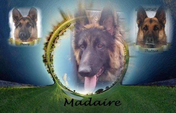 Bonjour Martine, Voici Madaire après presque 1 ans plus tard, un beau gros male intelligent et plein de vie. Madaire fais des cour de obédiences, je suis impressionné par ca faculté d apprendre. Ta réputation es partout dans le monde canin . Car ont me fais souvent le compliment sur la beauté de mon chien et la majorité me demande ou j ai eu Madaire, nul es surpris de ma réponse . Les intervenante ( propriétaire de l'Académiechien et du Centre éducatif canin des Laurentides. ) Mélanie et Véronique reconnais les trais de caractère de Dalton en Madaire. Madaire est une merveilleux berger allemand a poil long , très sportif et avec une intelligence impressionnante. Je reconnais aucune malice en mon beau Madaire, courageux sens peur et sens agressivité. Un berger allemand sur de lui dans c`est fonction de surveiller la maison. Photo : petit montage amateur, Madaire es mon sujet préférer. Johanne et Madaire ;-)